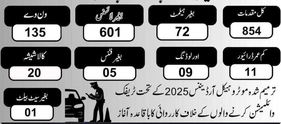 72 گھنٹوں میں ٹریفک قوانین کی خلاف ورزی کرنے پر کل 854 مقدمات درج کیے گئے، جن میں 601 شہری بغیر ڈرائیونگ لائسنس، ہیلمیٹ کے بغیر 72 ، ون وے خلاف ورزی پر 135 ، کم عمر ڈرائیور پر 11 ، کالے شیشے لگانے پر 20 ،فٹنس سرٹیفکیٹ کے بغیر گاڑی چلانے والے 05 ،سیٹ بیلٹ 01 اور  اضافی لوڈنگ کرنے پر  09 مقدمات درج کیے گئے