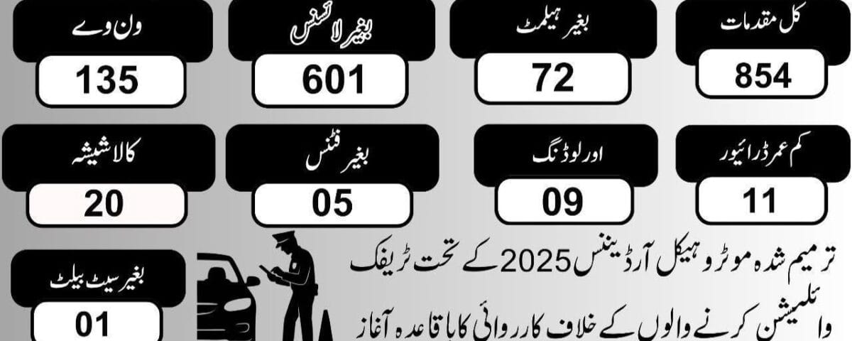 72 گھنٹوں میں ٹریفک قوانین کی خلاف ورزی کرنے پر کل 854 مقدمات درج کیے گئے، جن میں 601 شہری بغیر ڈرائیونگ لائسنس، ہیلمیٹ کے بغیر 72 ، ون وے خلاف ورزی پر 135 ، کم عمر ڈرائیور پر 11 ، کالے شیشے لگانے پر 20 ،فٹنس سرٹیفکیٹ کے بغیر گاڑی چلانے والے 05 ،سیٹ بیلٹ 01 اور  اضافی لوڈنگ کرنے پر  09 مقدمات درج کیے گئے