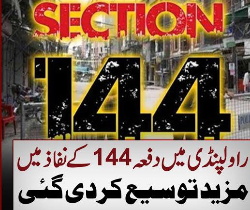 دفعہ 144کے نفاذ کا ڈپٹی کمشنر راولپنڈی حسن وقار چیمہ نے نوٹیفکیشن بھی جاری کردیا، نوٹیفیکیشن کے مطابق راولپنڈی میں جلسے،جلوس،ریلیوں پر مکمل پابندی عائد رہے گی، اسلحے کی نمائش پر بھی پابندی عائد رہے گی۔