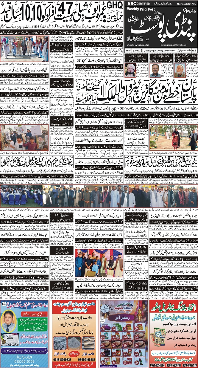 گورنر پنجاب سردار سلیم حیدر خان کا پنڈی گھیب دورہ، سانحہ گیس لیکیج میں جاں بحق نوجوانوں کے لواحقین سے اظہارِ تعزیت پاکستان آرمی کی عسکری صلاحیت ،پیشہ وارانہ مہارت اور دفاعی تیاری پوری قوم کے لئے باعث فخر ہے ، ملک حاجی افتخار احمد اعوان اٹک : پاک فوج کے دو شہید جوانوں محمد آصف خٹک اور ذوالفقار علی خٹک کو انتہائی عقیدت و احترام کے ساتھ سپرد خاک کر دیا گیا۔ آپریشن مری کا آغاز ڈاک خانہ چوک کی قدیم اور تاریخی عمارت کو مسمار کرتے ہوئے شروع کر دیا گیا۔ پٹرول کی مصنوعی قلت کا خدشہ پٹرول پمپوں پر لمبی قطاریں جڑواں شہروں سمیت مختلف اضلاع میں سرچ آپریشن، 20 افغانیوں سمیت متعدد مشتبہ افراد گرفتار تھانہ روات پولیس کی بڑی کارروائی حساس ادارے کے جعلی کارڈ والا افغانی گرفتار سابق وزیر اعظم عمران خان کو علاج کیلیے شفاء اسپتال منتقل کرنے کی درخواست پر نوٹس جاری راولپنڈی کے ایک گھر میں چوری و نقب زنی کی واردات کا ڈراپ سین، کرایہ دار ہی چور نکلا۔ سابق وزیر اعظم عمران خان تک رسائی کے لیے عظمیٰ خان کا اسلام آباد ہائی کورٹ سے رجوع